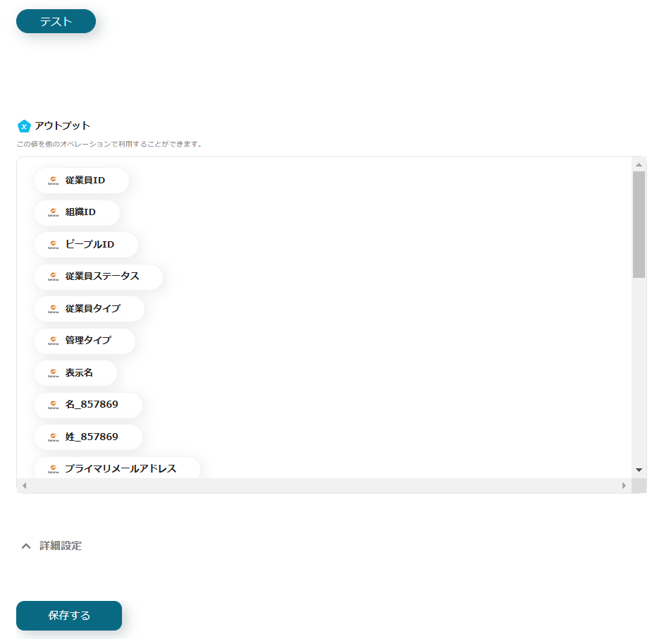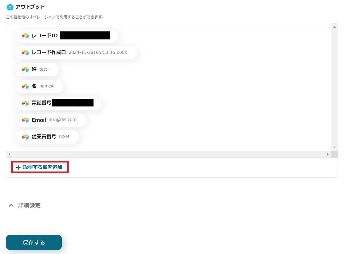「+取得する値を追加」をクリックし、マネーフォワード Adminaに登録したい項目を追加して保存します。