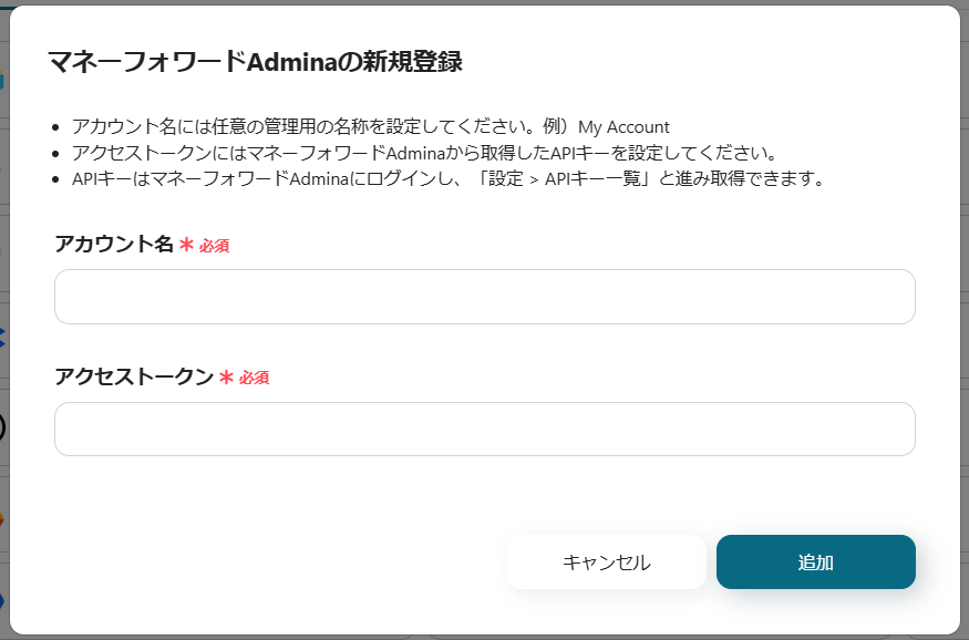 ・アカウント名、アクセストークンを入力し、「追加」をクリックすると、マイアプリに登録が完了します。