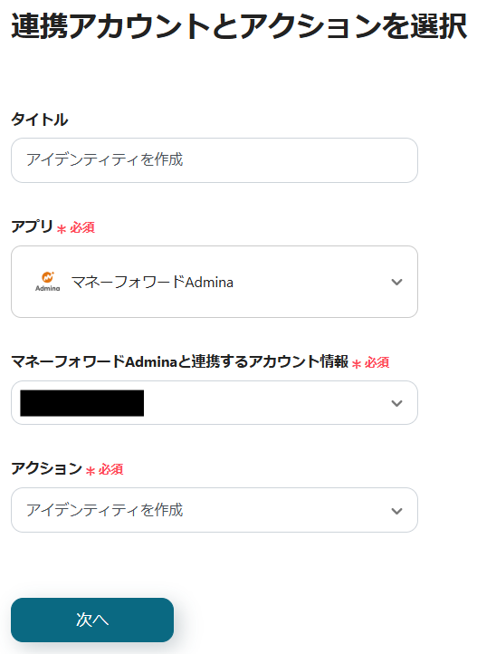 2.マネーフォワード Adminaと連携するアカウントを確認し、「次へ」をクリックします。