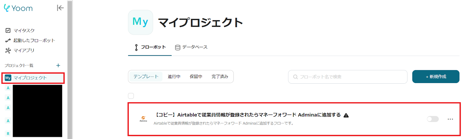 1.Yoom管理画面の「マイプロジェクト」を選択し、「【コピー】Airtableで従業員情報が登録されたらマネーフォワード Adminaに追加する」をクリックします。