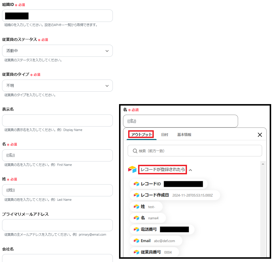 ※空欄には、枠をクリックして表示されるアウトプットの「レコードが登録されたら」から選択します。(値は二重括弧で表示されます)これにより従業員ごとに変わる内容を動的に反映できます。また、定型文を直接入力することもできます。
