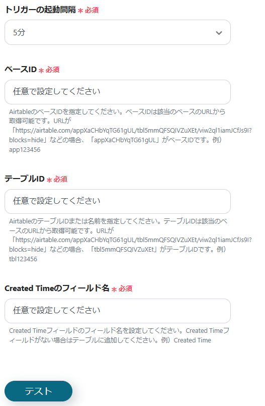 4.トリガーの起動間隔、Airtableの情報を設定し、テストを行います。