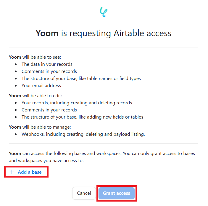 ・ログインをして下記画面の「+Add a base」から、連携させたいベースやワークスペースを選択します。