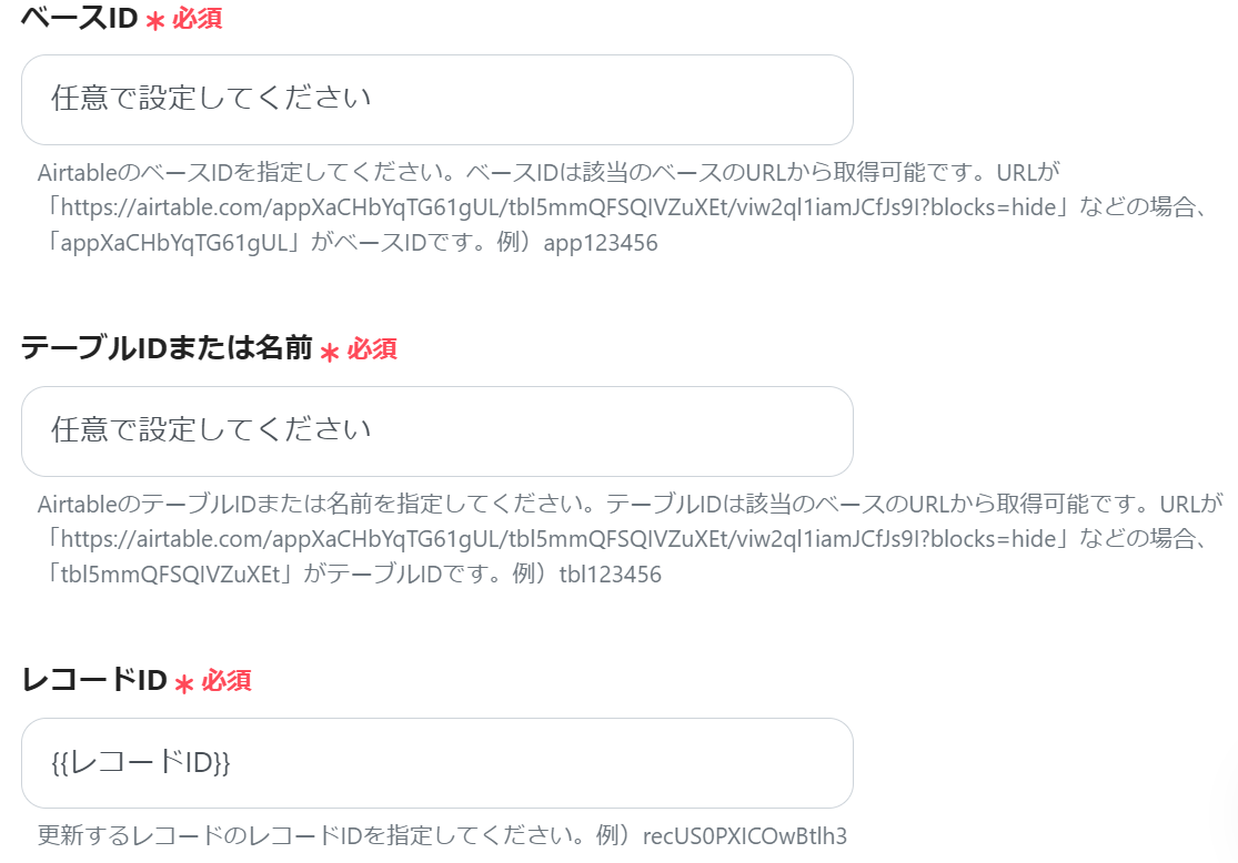 続いて、Airtableでレコードを更新する設定を行うため、「レコードを更新」をクリックします。