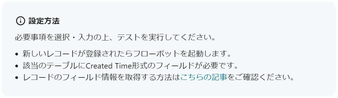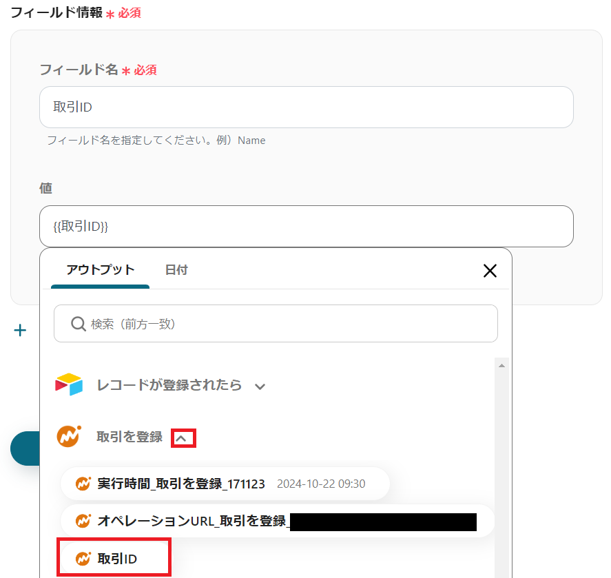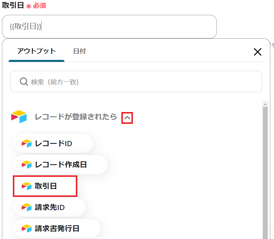 スクロールし、「レコードが登録されたら」のアウトプットを使用して、必須項目を設定してください。