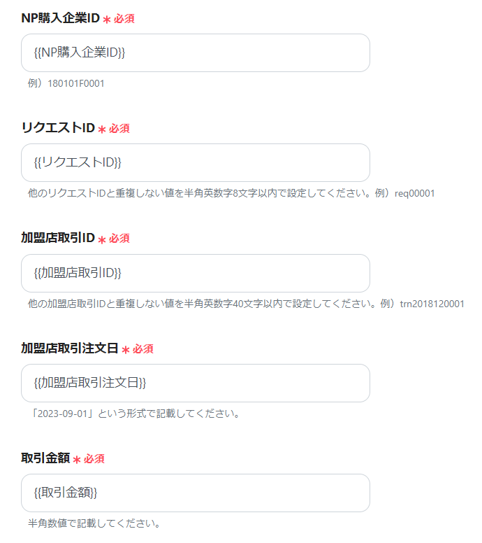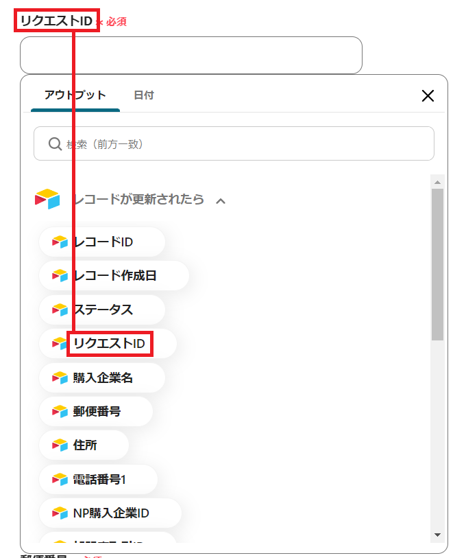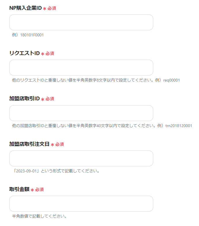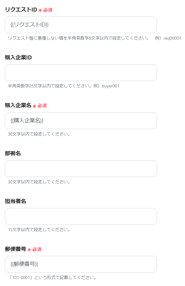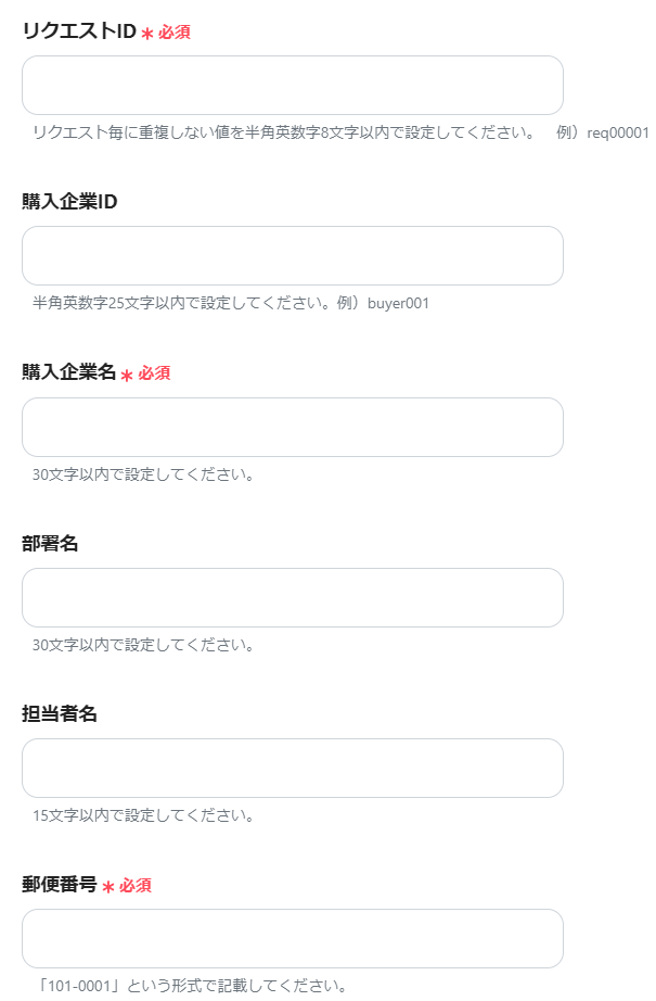 リクエストIDや購入企業名、郵便番号など、必須項目になっているボックスを入力しましょう。