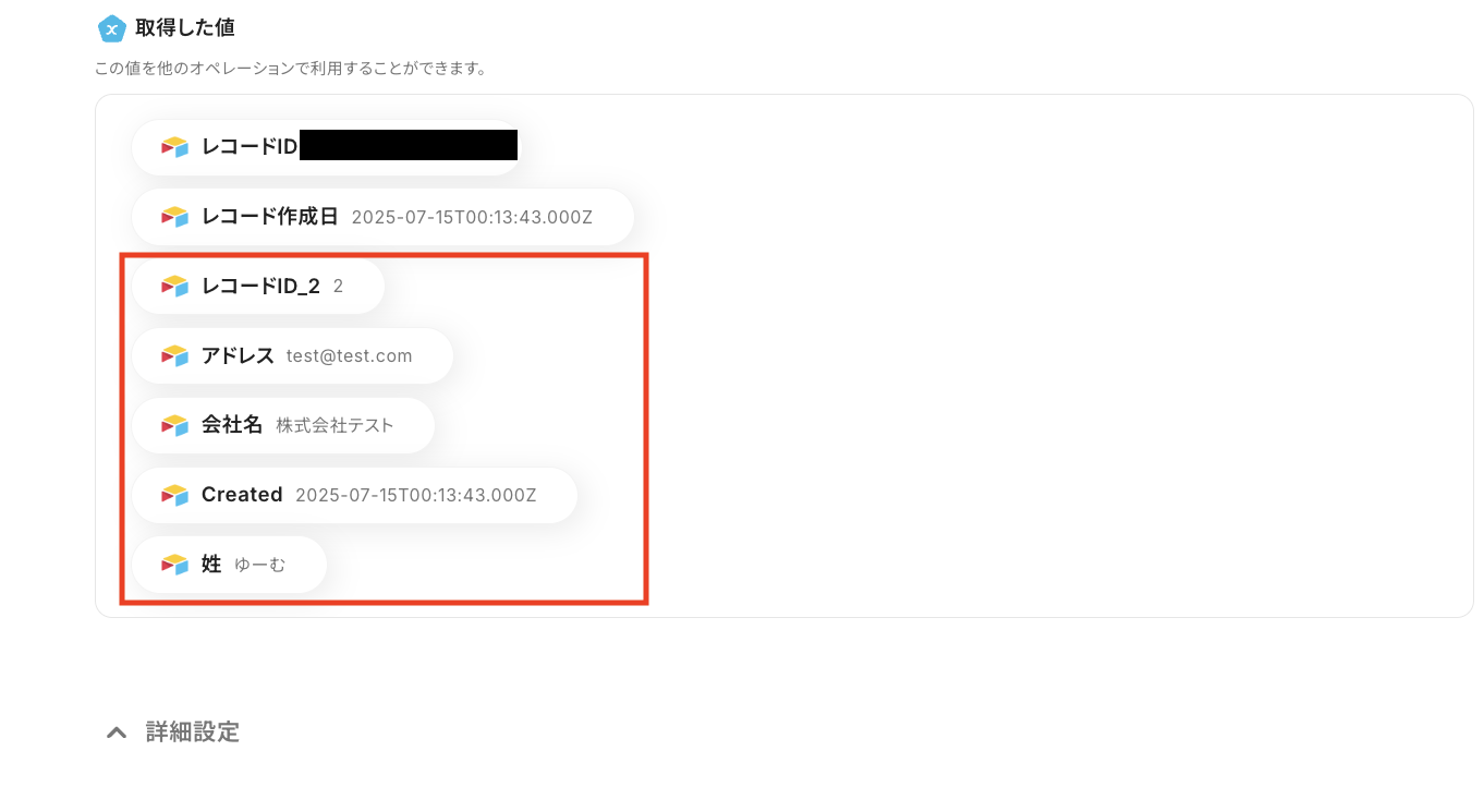 アウトプット情報は、「この値を他のオペレーションで利用することができます。」という注釈の通り、この後のステップで引用・活用できます。