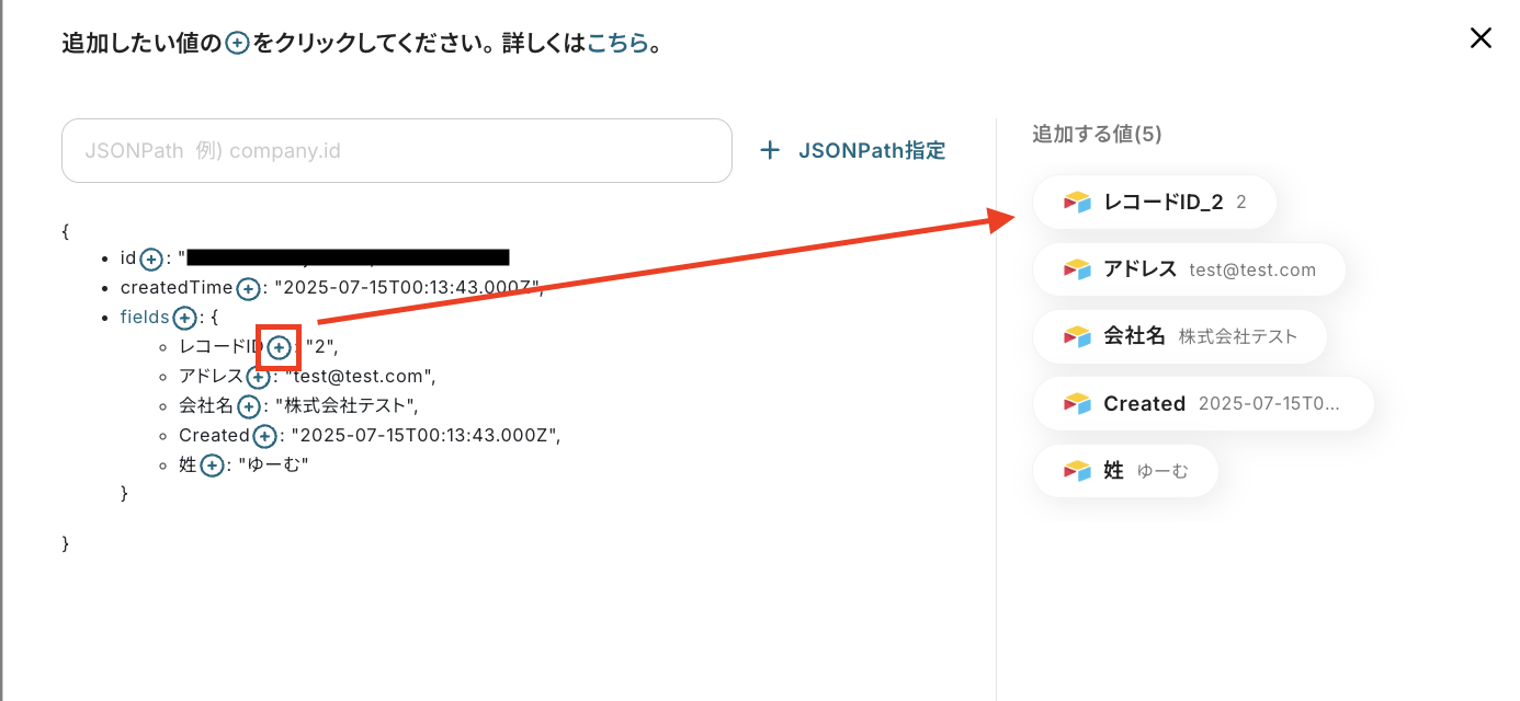 ・AirtableのアウトプットはJSONPathから取得可能です。取得方法は下記をご参照ください。