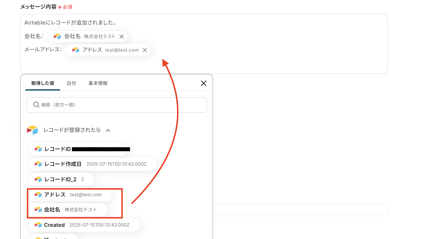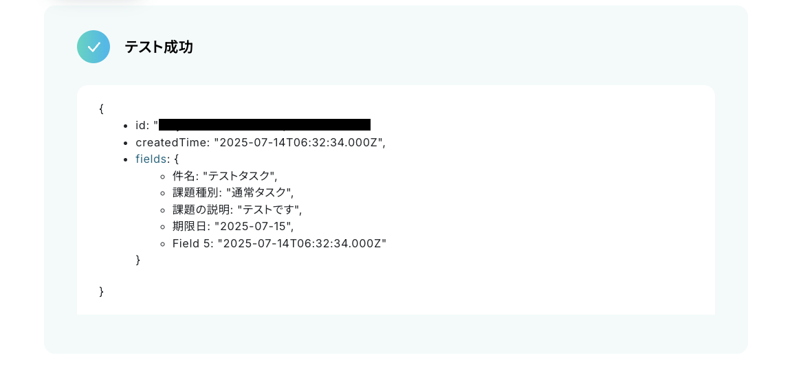 Airtable側でレコードを登録した後、[テスト]をクリックします。(以下はテスト成功の一例です。)