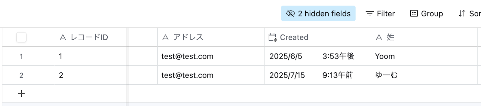 今回は、Airtableで以下のようなテストデータを入れてフローを作成しています。