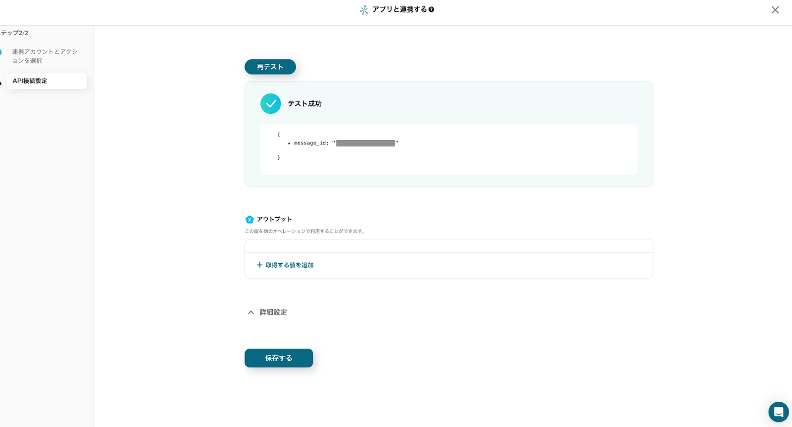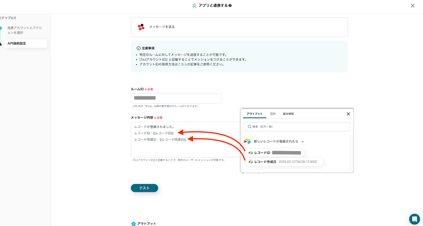 「メッセージ内容」は、任意で編集できます。今回は「レコードが登録されました。」というテキストと、候補から「レコードID」と「レコード作成日」を追加しました。