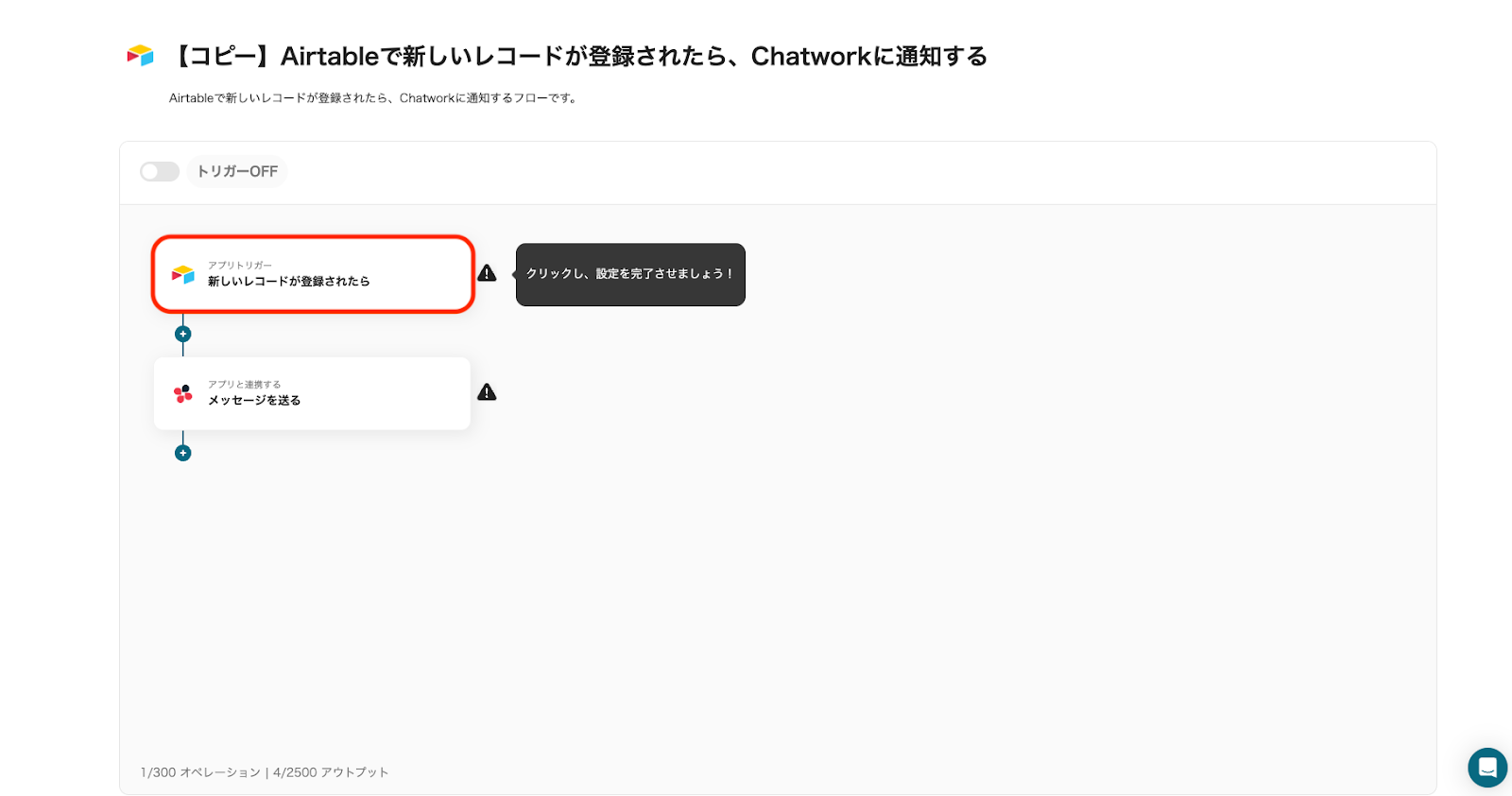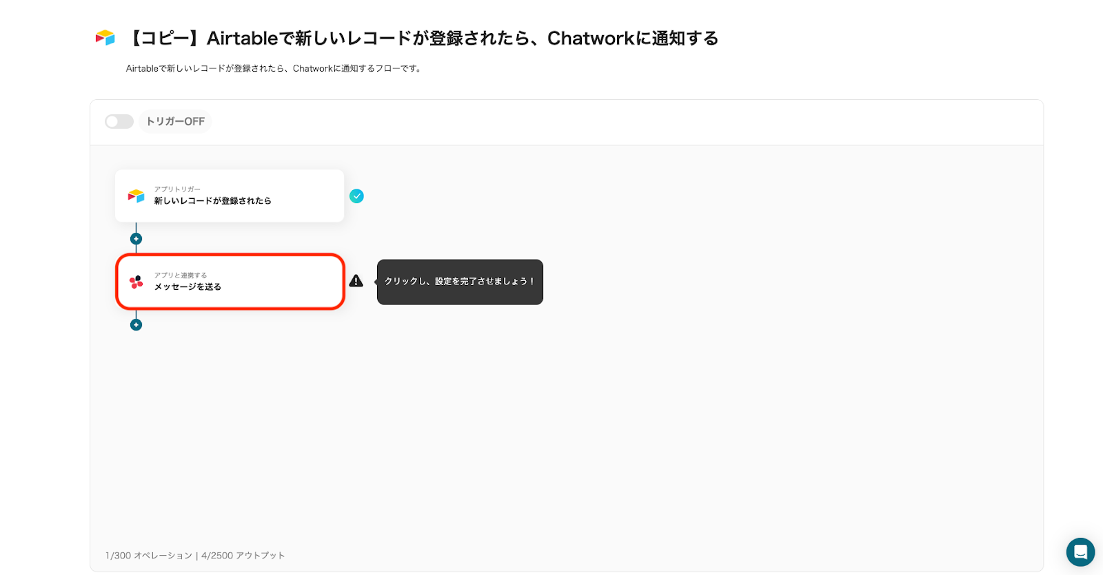 これで、Airtableで新しいレコードが登録されたらChatworkに自動で通知されます。