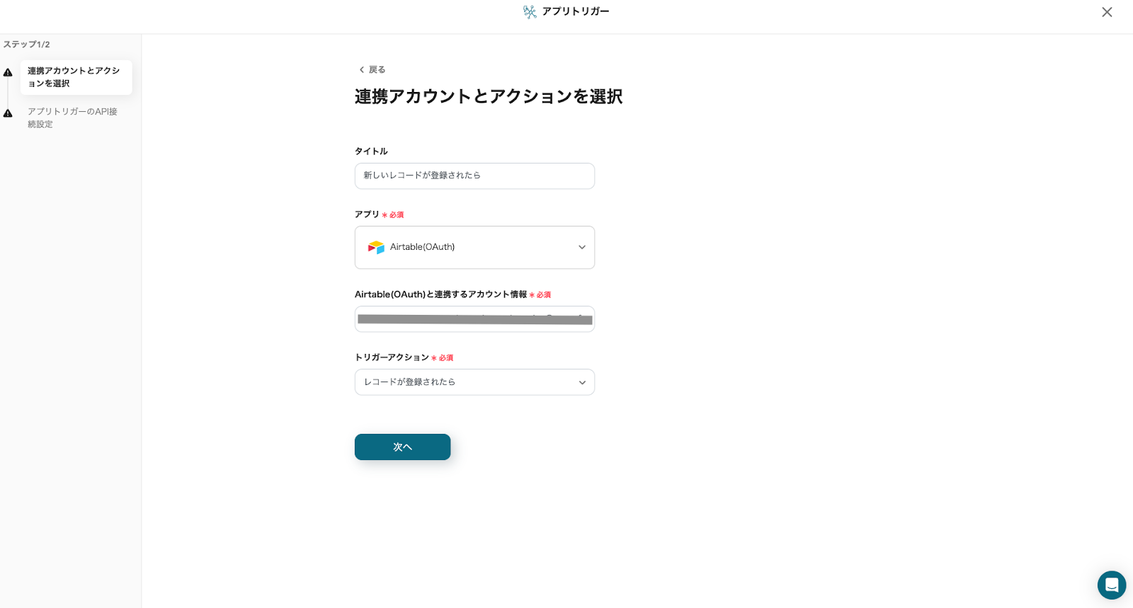 タイトルは編集可能ですが、トリガーアクションは変更せず「次へ」をクリックしてください。
