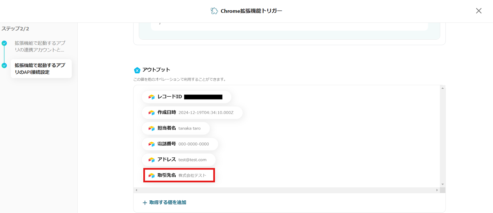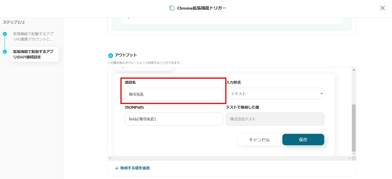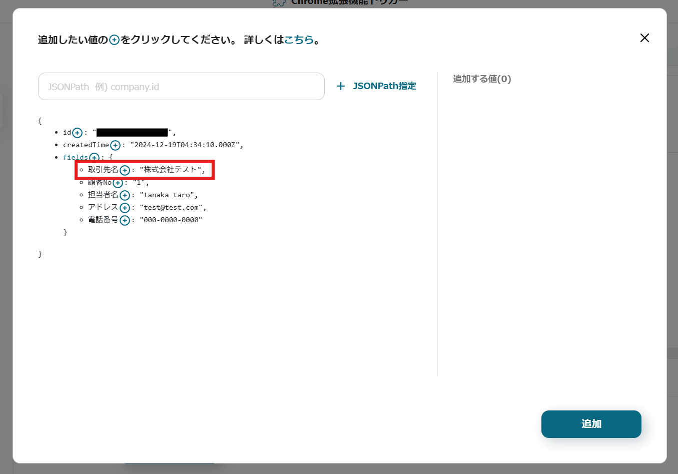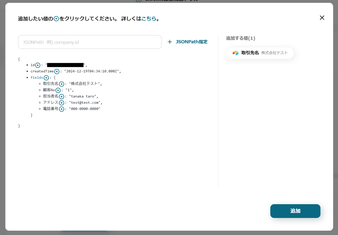 画像のように青く「テスト成功」と表示が出たら、freee会計に反映したいAirtableのデータをJSONPATHでアウトプットとして取得します。