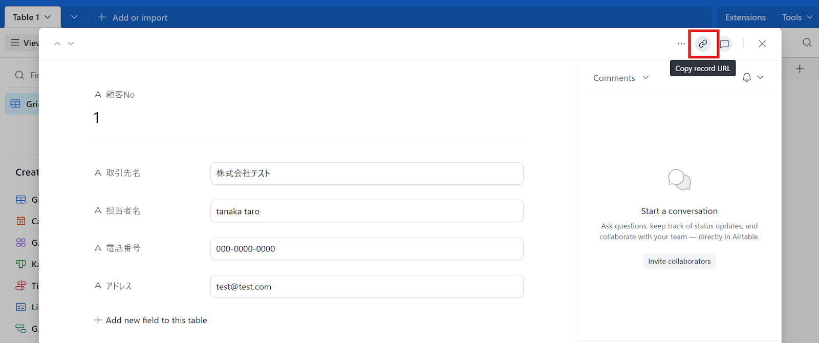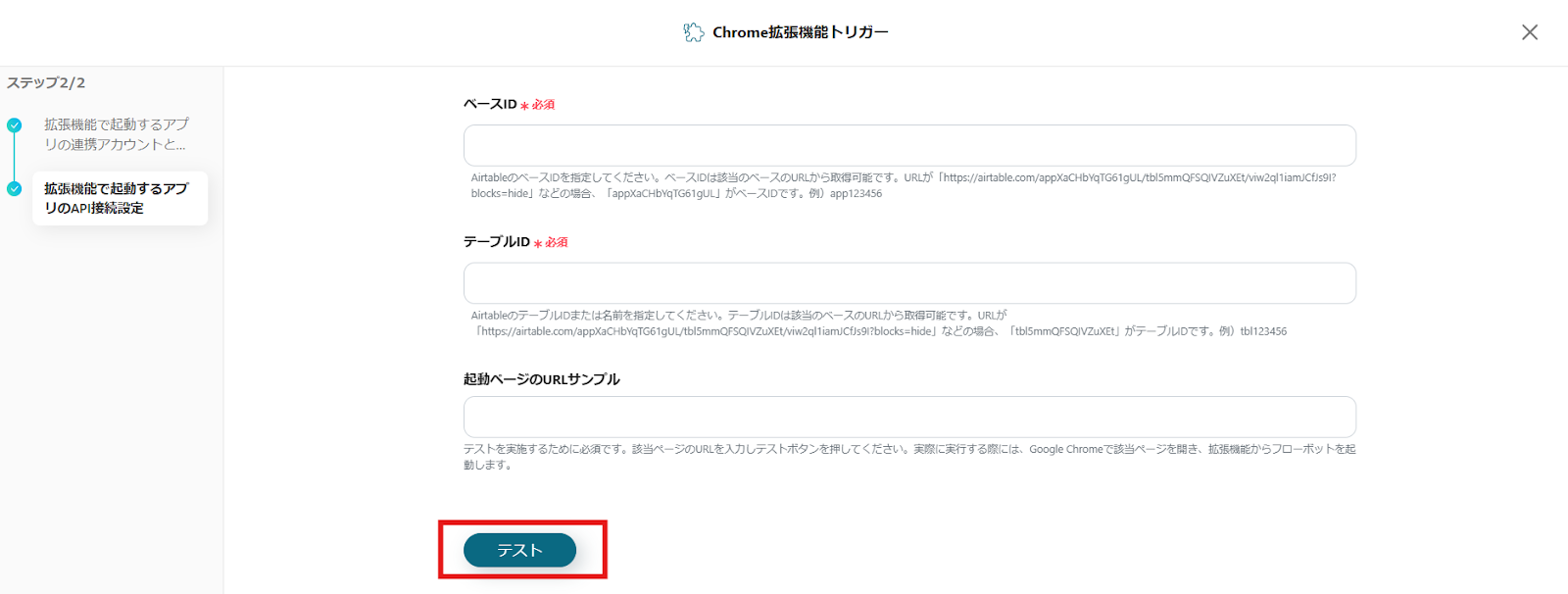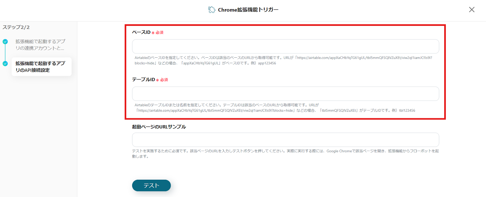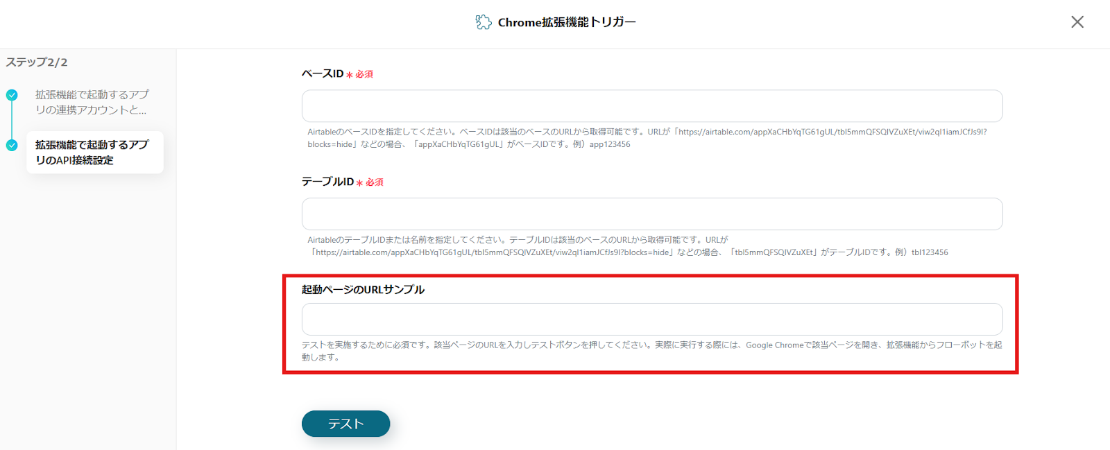 Airtableの詳細ページからChrome拡張機能を起動するため、Airtableの詳細ページURLを入力します。