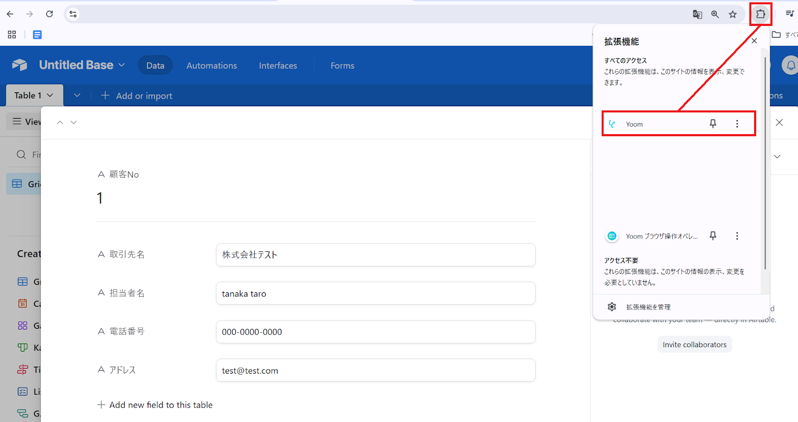 その後Airtableにアクセスし、右上のChrome拡張機能のボタンからYoomを選択してください。