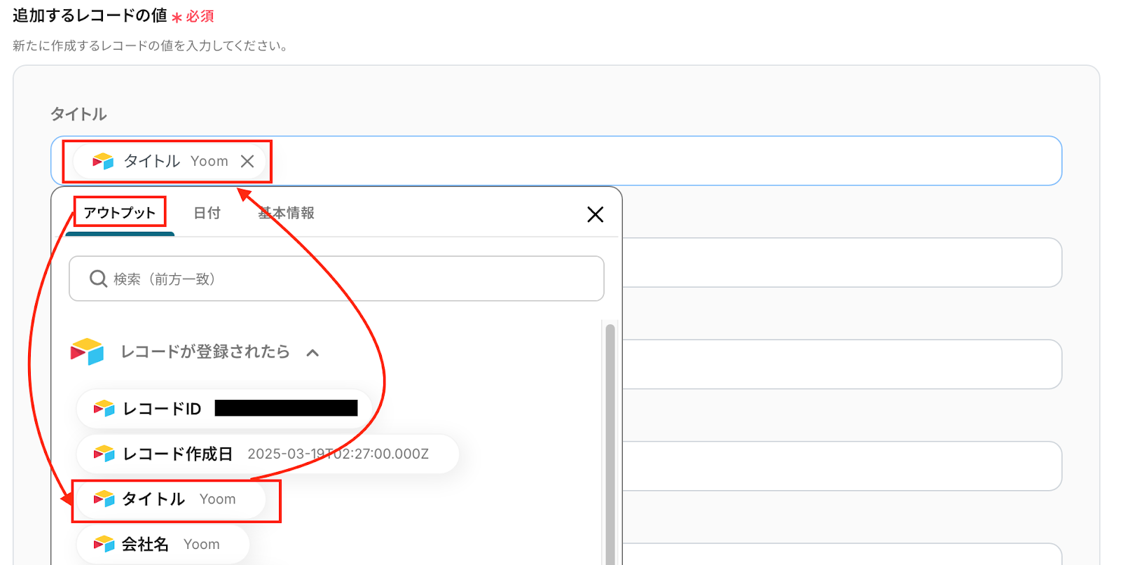 (以下は例として、「タイトル」の項目に前ステップで取得した【タイトル】の情報を引用したものです。)