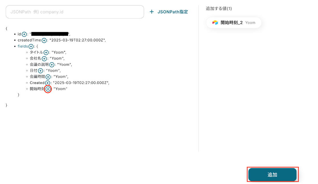 追加したい値の横にある「+」ボタンを押下することでアウトプットに追加可能です。