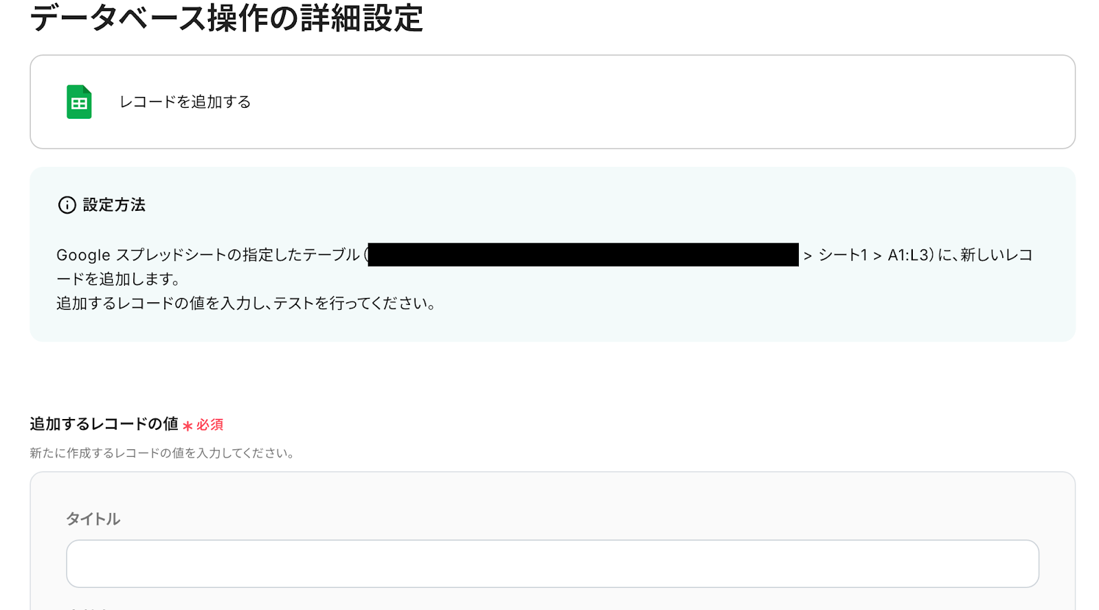 ここでは、 Google スプレッドシートにレコードを追加する設定をします。