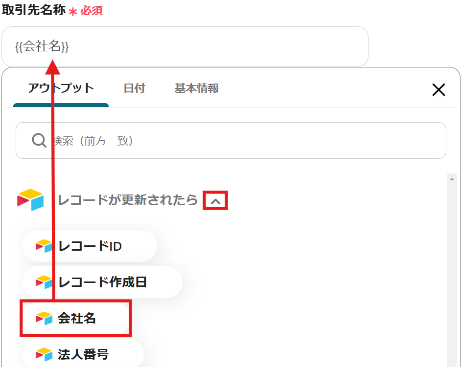以下の画面が表示されるので、「取引先名称」を設定しましょう。