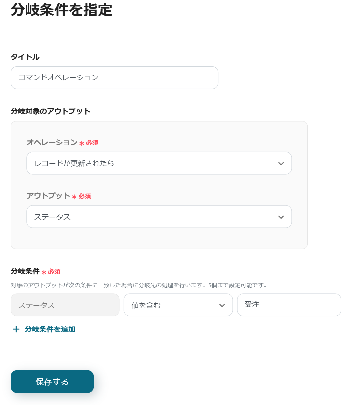 今回は、ステータスが「受注」に更新された場合にトリガーを起動する設定を行うので、以下のように設定しました。