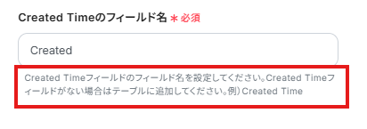 6.「Created Timeのフィールド名」は、入力欄下の説明に従って、入力してください。