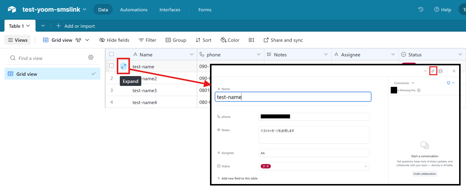 6.顧客にSMSLINKを送るときは、Airtableで対象のレコードの詳細を開きます。