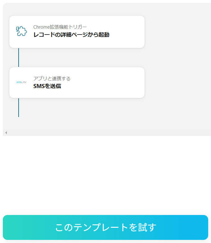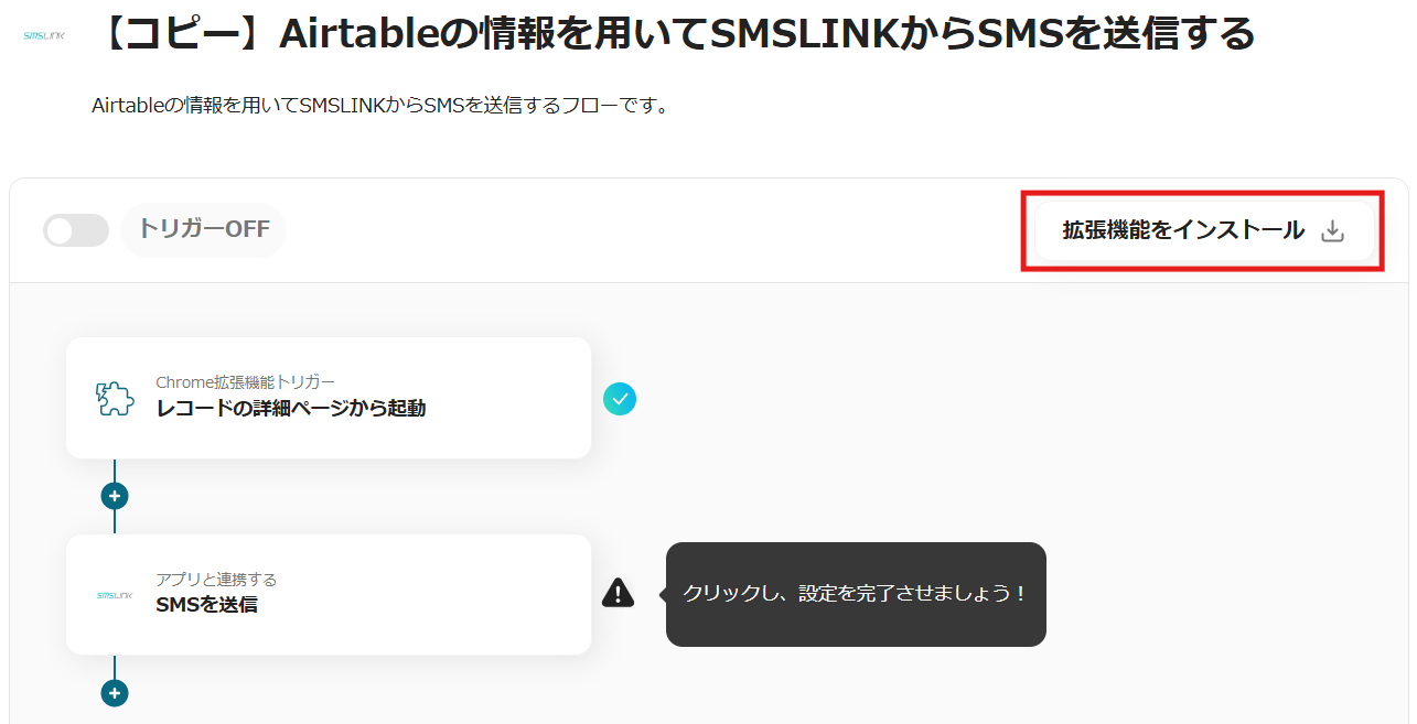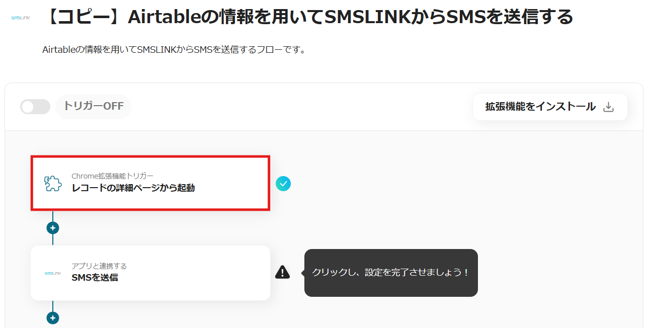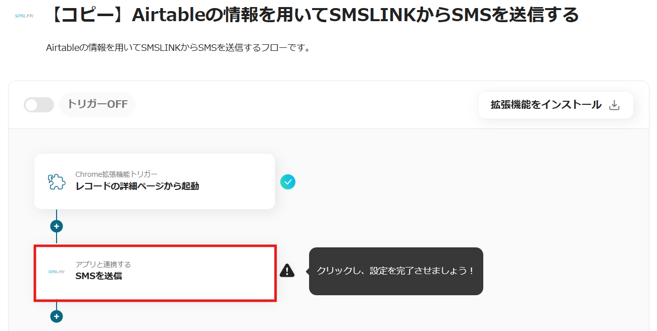 ・フローの起点となるAirtableとChrome拡張機能のトリガー設定、その後に続くSMSLINKの送信設定