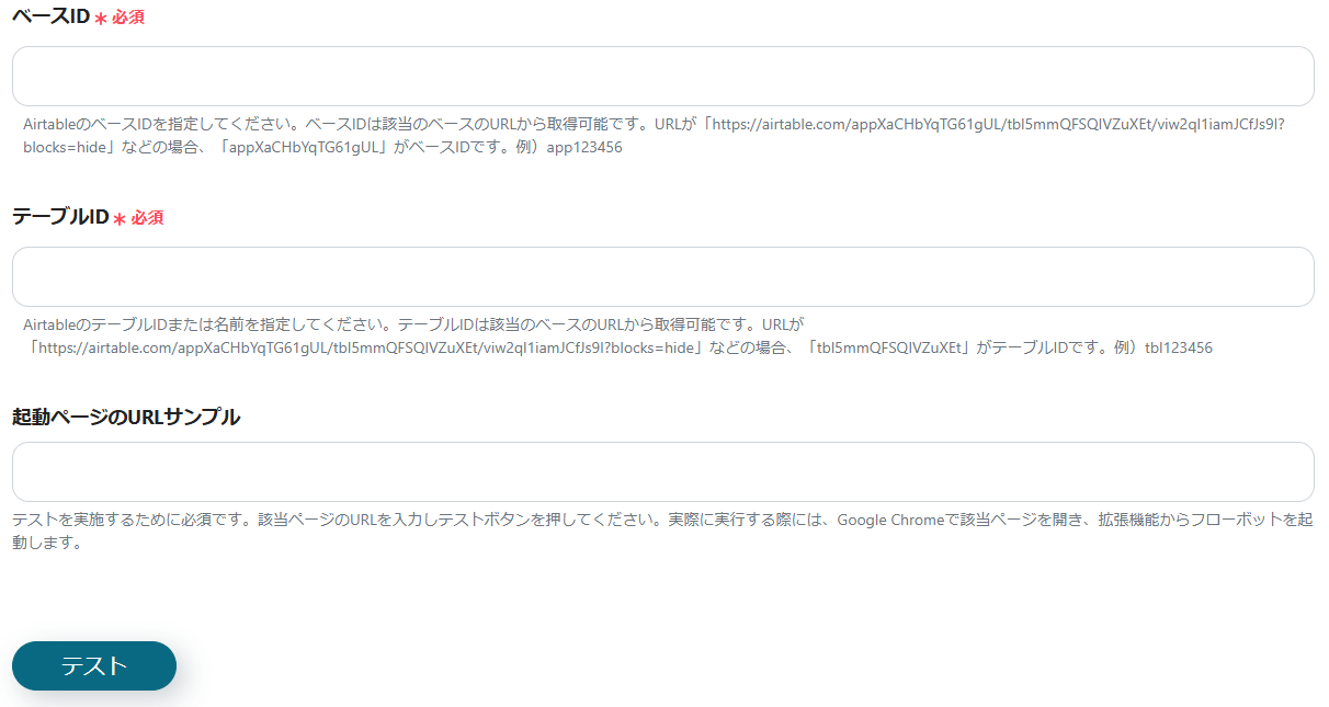 7.ベースID、テーブルID、起動ページのURLサンプルを入力し、テストを行います。