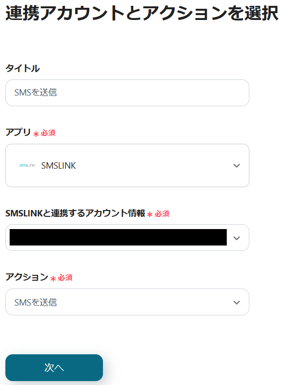 2.SMSLINKと連携するアカウント情報を確認し、「次へ」をクリックします。