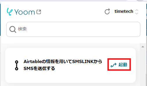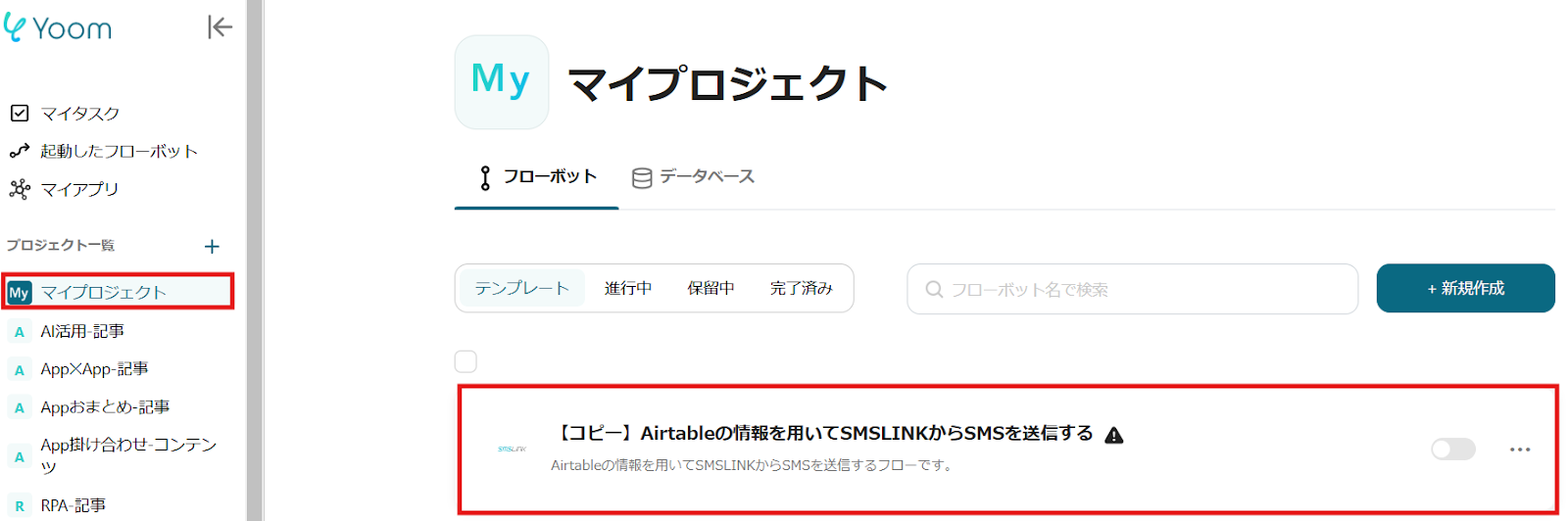 1.Yoom管理画面の「マイプロジェクト」を選択し、「【コピー】Airtableの情報を用いてSMSLINKからSMSを送信する」をクリックします。
