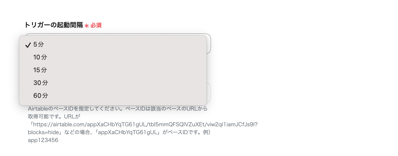 (4)次の画面で設定する「トリガーの起動間隔」は5分、10分、15分、30分、60分から任意のものを選択してください。