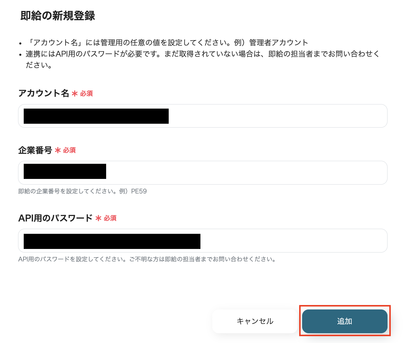 (4)「アカウント名」と「企業番号」、「API用のパスワード」を入力し、[追加]をクリックします。