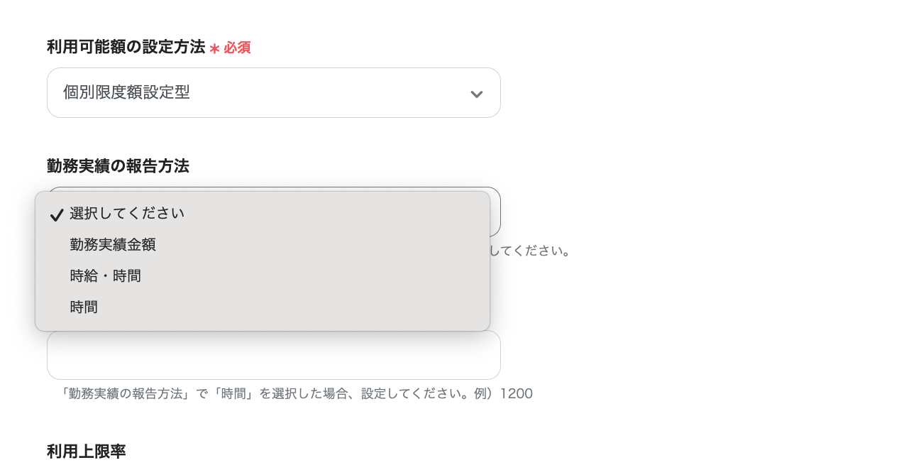 (4)「利用可能額の設定方法」や「勤務実績の報告方法」の項目は、プルダウンから運用に沿った内容を選択できます。