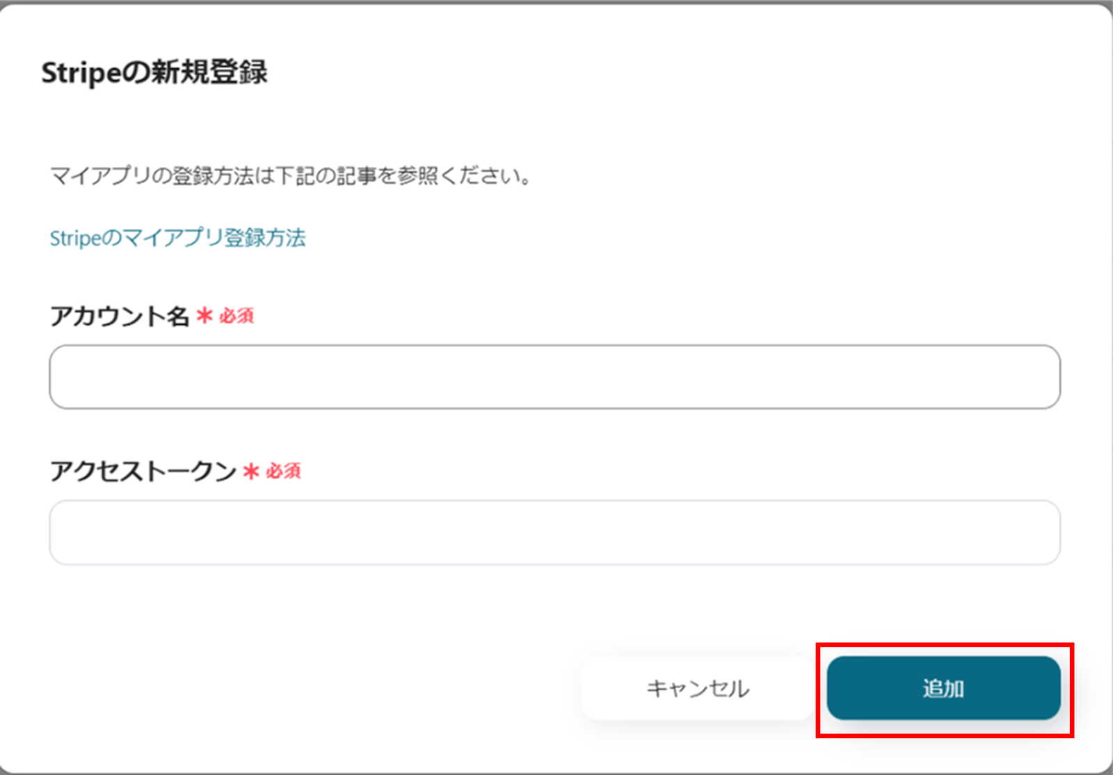 (5)「Stripeの新規登録」画面から、アカウント名、アクセストークンを入力し、「追加」をクリックします。