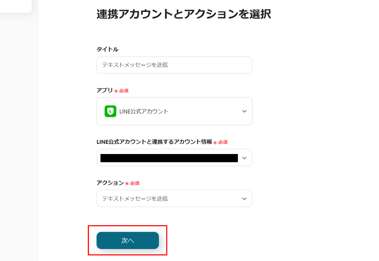 (2)LINE公式アカウントの「連携アカウントとアクションを選択」画面から、LINE公式アカウントと連携するアカウント情報に誤りがないかを確認し、アクションは「テキストメッセージを送信」のままで「次へ」をクリックします。