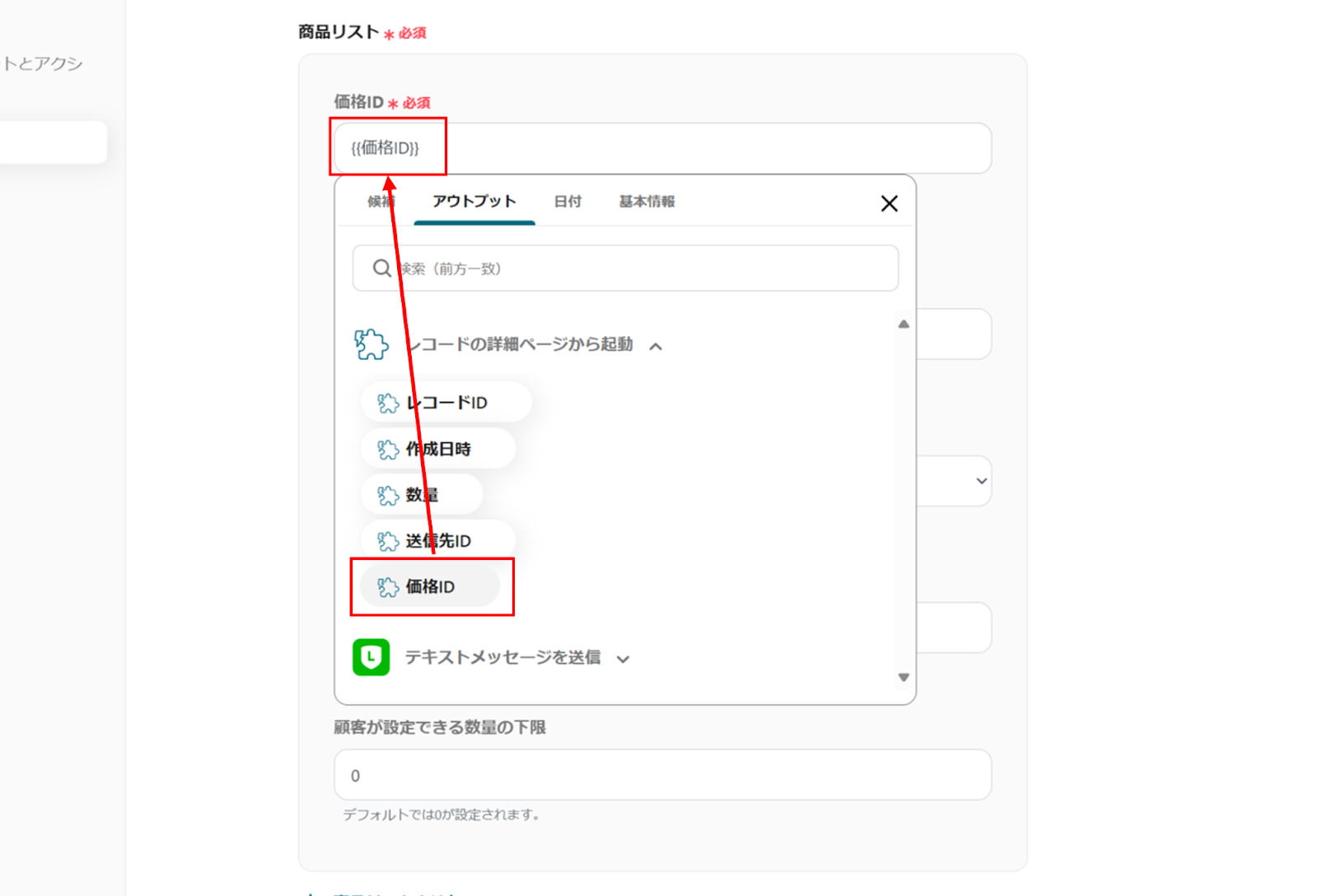 (3)「API接続設定」画面から、価格ID、数量をアウトプットから選択します。