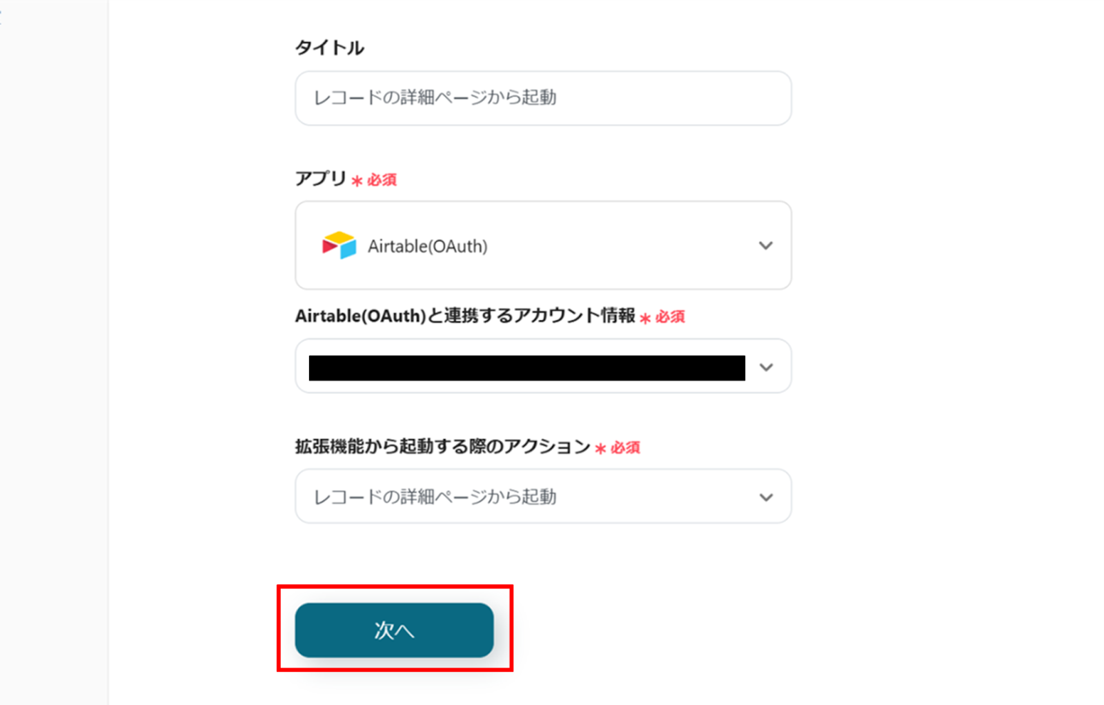 下へ進み、Airtableと連携するアカウント情報に誤りがないかを確認し、拡張機能から起動する際のアクションは「レコード詳細ページから起動」のままで「次へ」をクリックします。