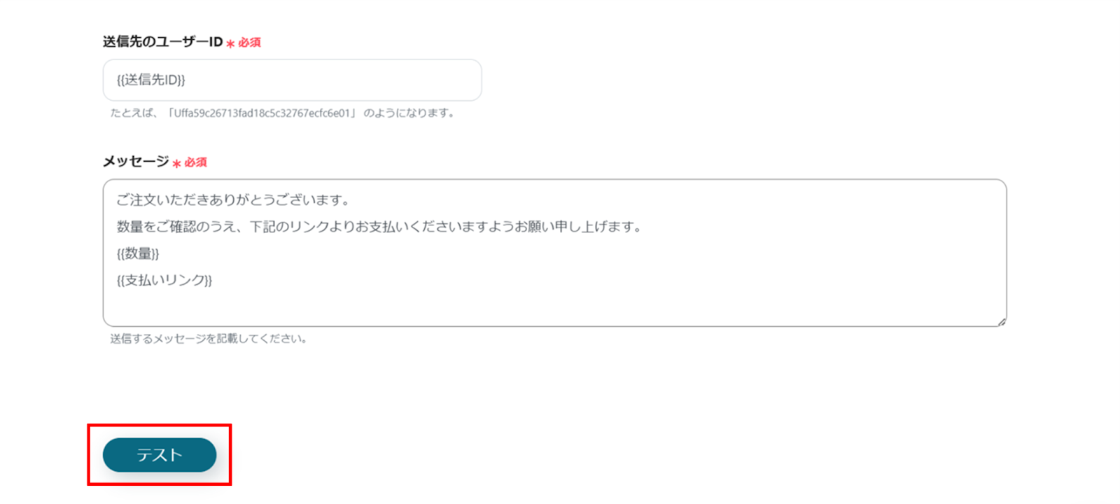 入力が完了したら、「テスト」をクリックし、エラーが発生しなければ、下部にある「保存する」をクリックします。