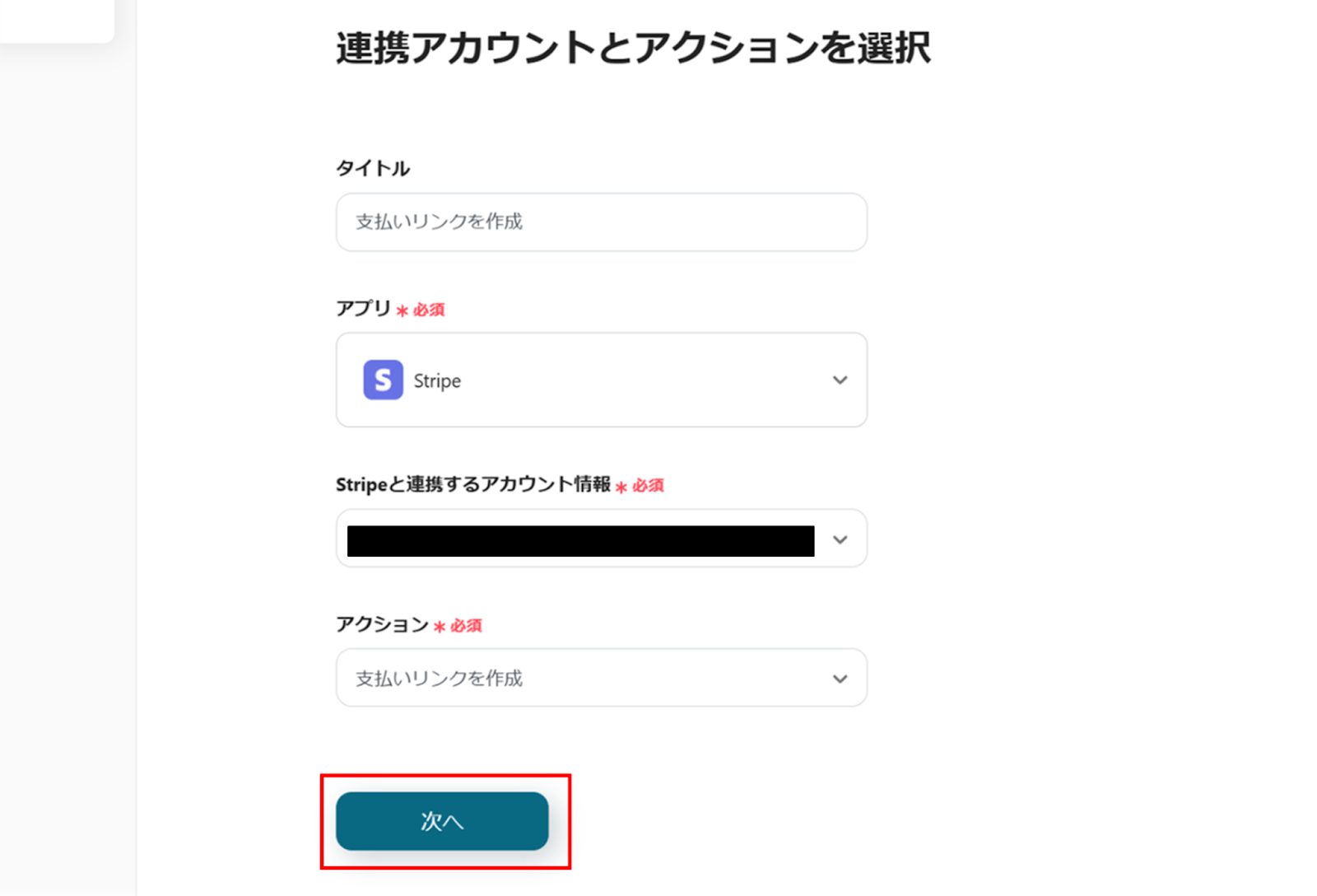 (2)Stripeの「連携アカウントとアクションを選択」画面から、Stripeと連携するアカウント情報に誤りがないかを確認し、アクションは「支払いリンクを作成」のままで「次へ」をクリックします。