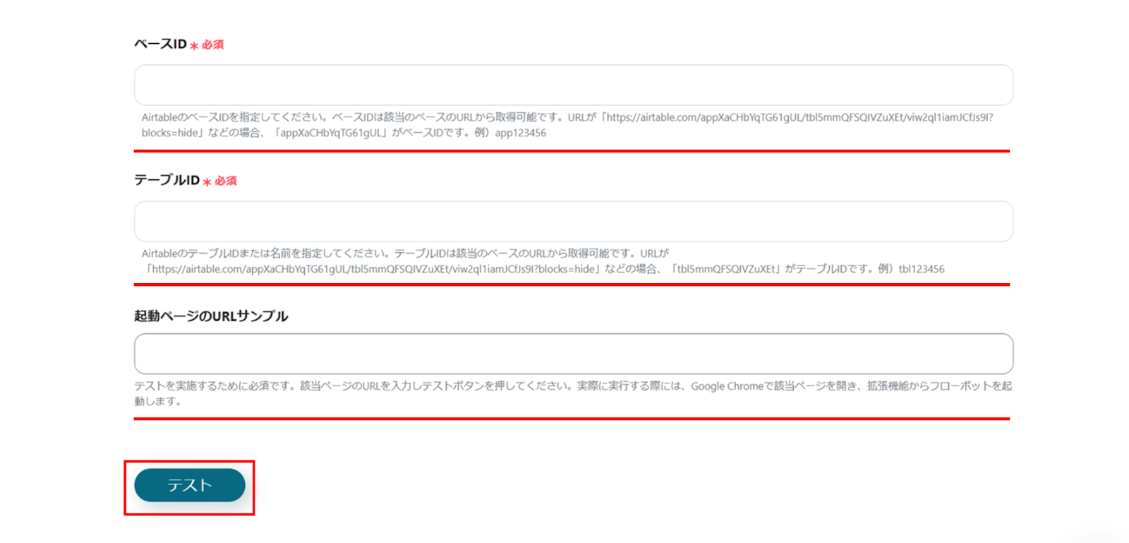(3)「拡張機能で起動するアプリのAPI接続設定」画面から、赤線を確認の上、ベースID、テーブルID、起動ページのURLサンプルを入力します。
