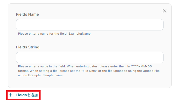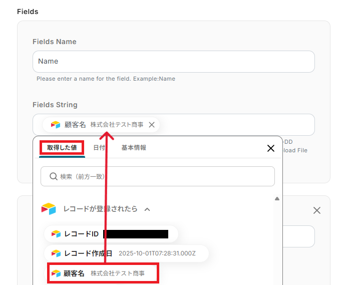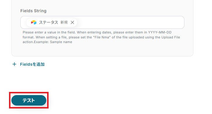 「Fields String」は、Fields Nameに合わせて取得した値から選択しましょう。