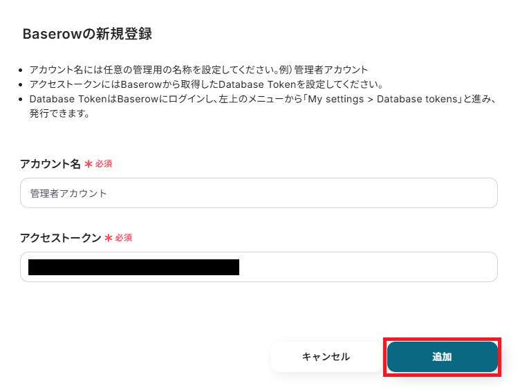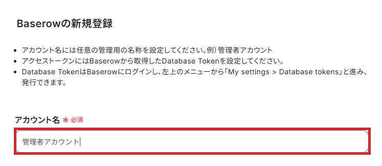「アクセストークン」は、Baserowにログインして取得する必要があります。