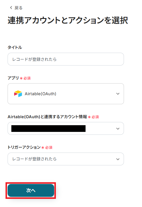Airtableと連携するアカウントに間違いがないかを確認し、「次へ」をクリックしましょう。