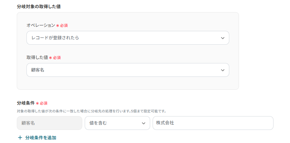 画像の場合は顧客名に株式会社が含まれる場合のみフローが進行します。このように設定を行うことで、特定条件のデータのみを同期可能です。