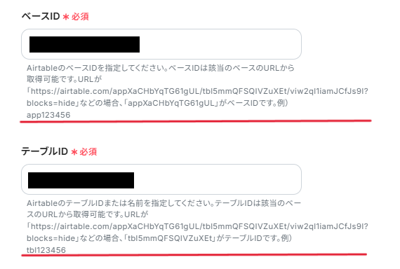 「ベースID」と「テーブルID」は、入力欄下の説明に従って入力してください。