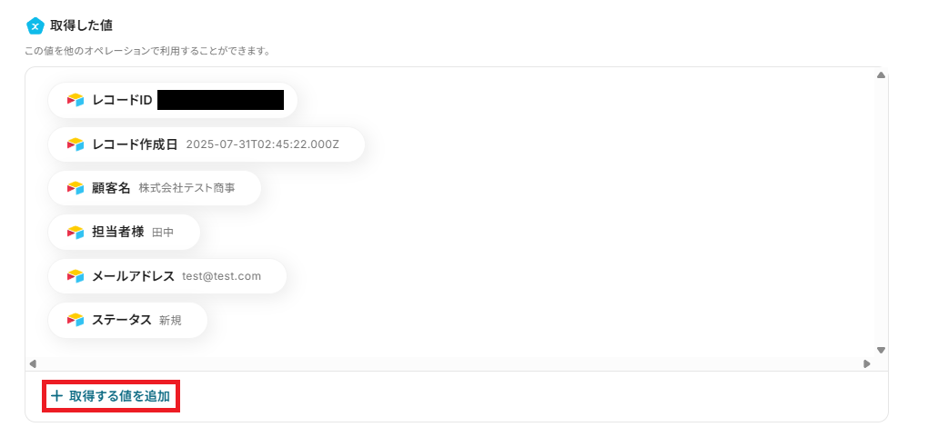 なお、取得した値にはAirtableのデータが表示されていますが、Baserowに連携したい取得しきれていないレコードが存在する場合は、「+取得する値を追加」から追加できます。