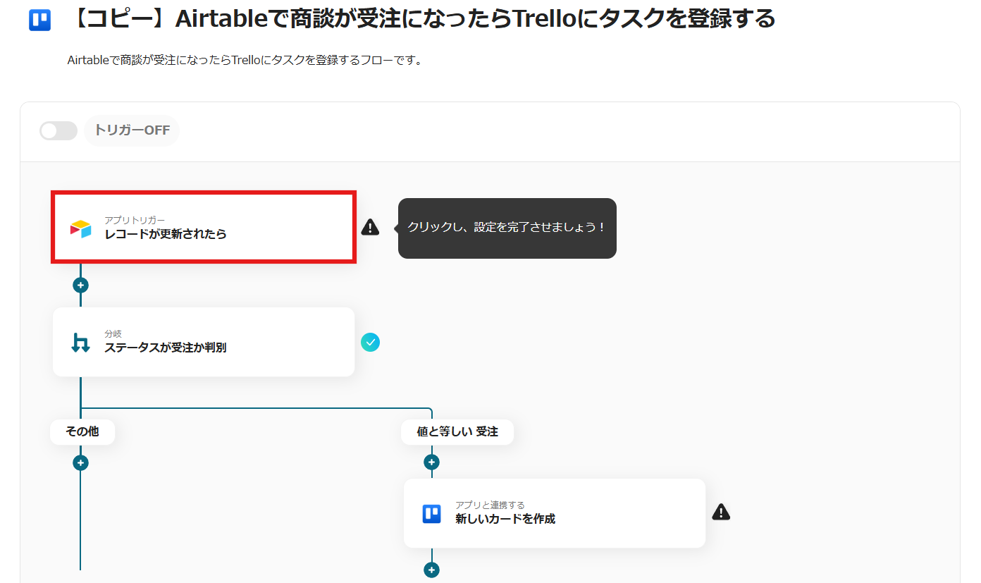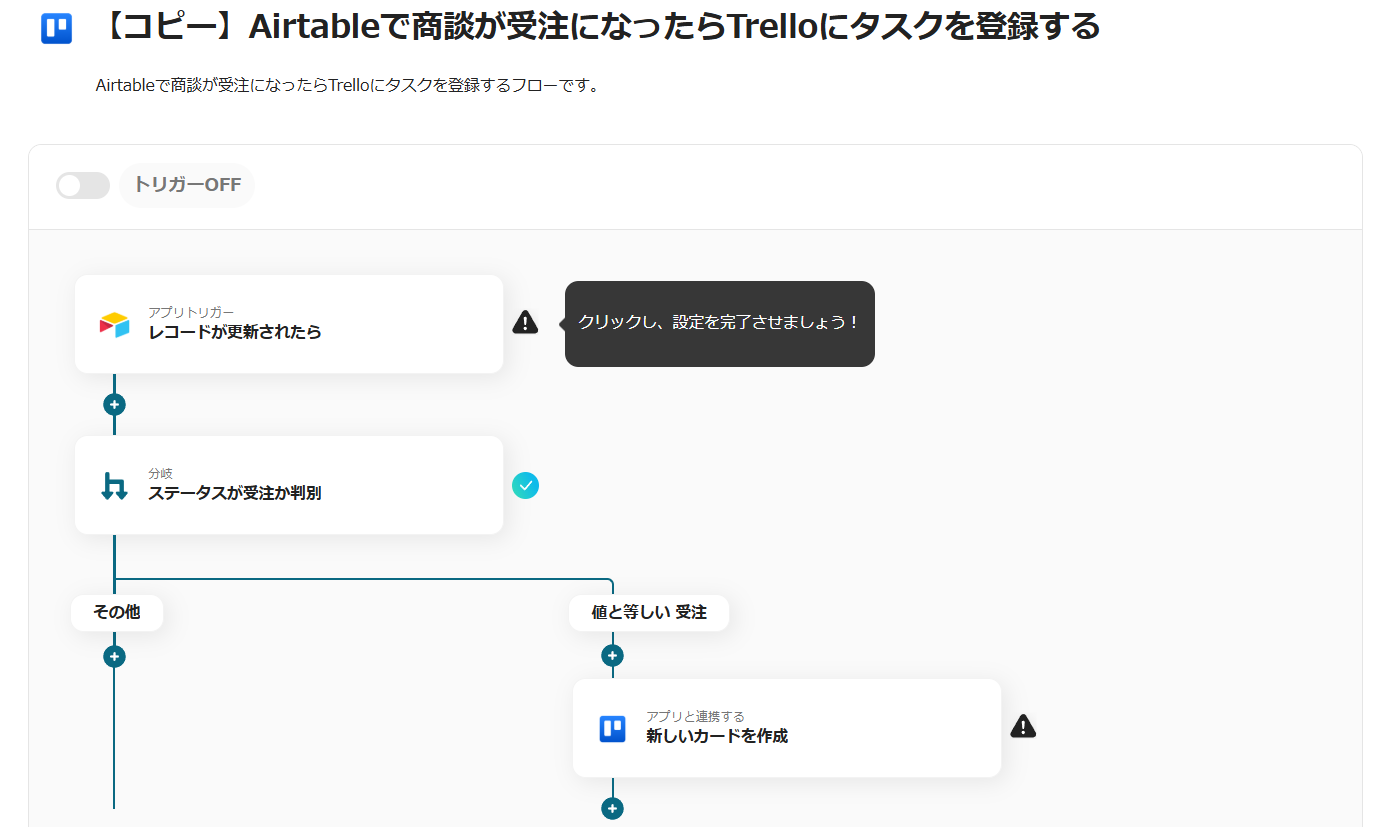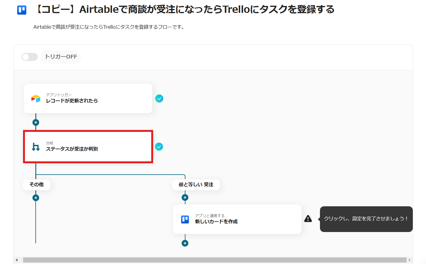 テンプレートを活用しているため、設定は完了しています。画像と同じ状態になっているか確認しましょう。この設定をすることにより、Airtableのデータのステータスが「受注」になったらフローボットが稼働します。