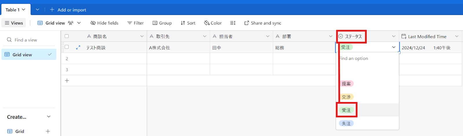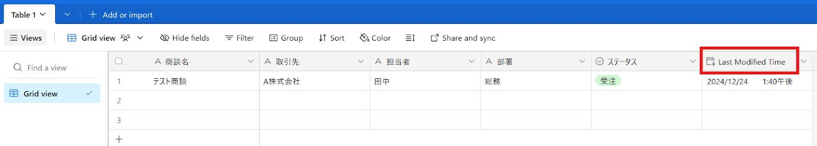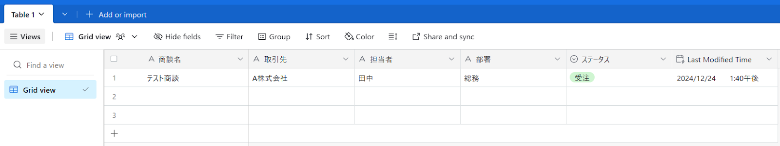 尚、ご用意いただくAirtableは上記の通りではなくても問題ありませんが、「Last Modified Time(最終更新日時)」と「ステータス(受注)」のフィールドは必ず用意しておきましょう。