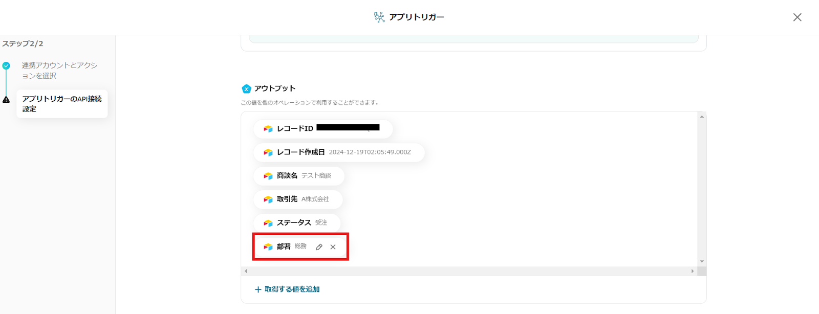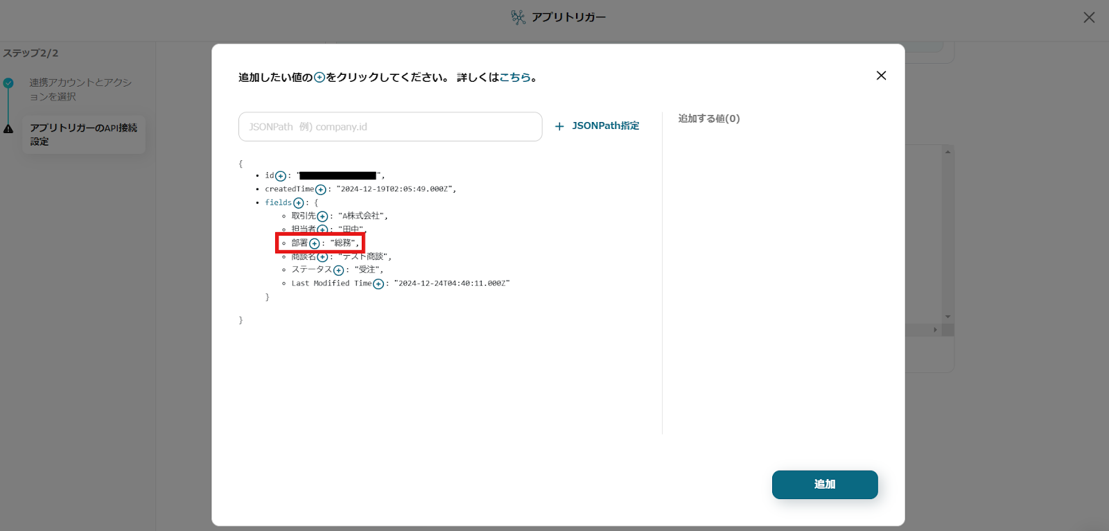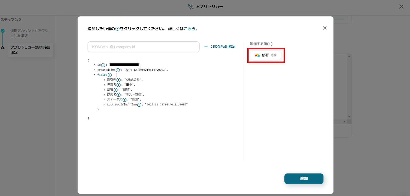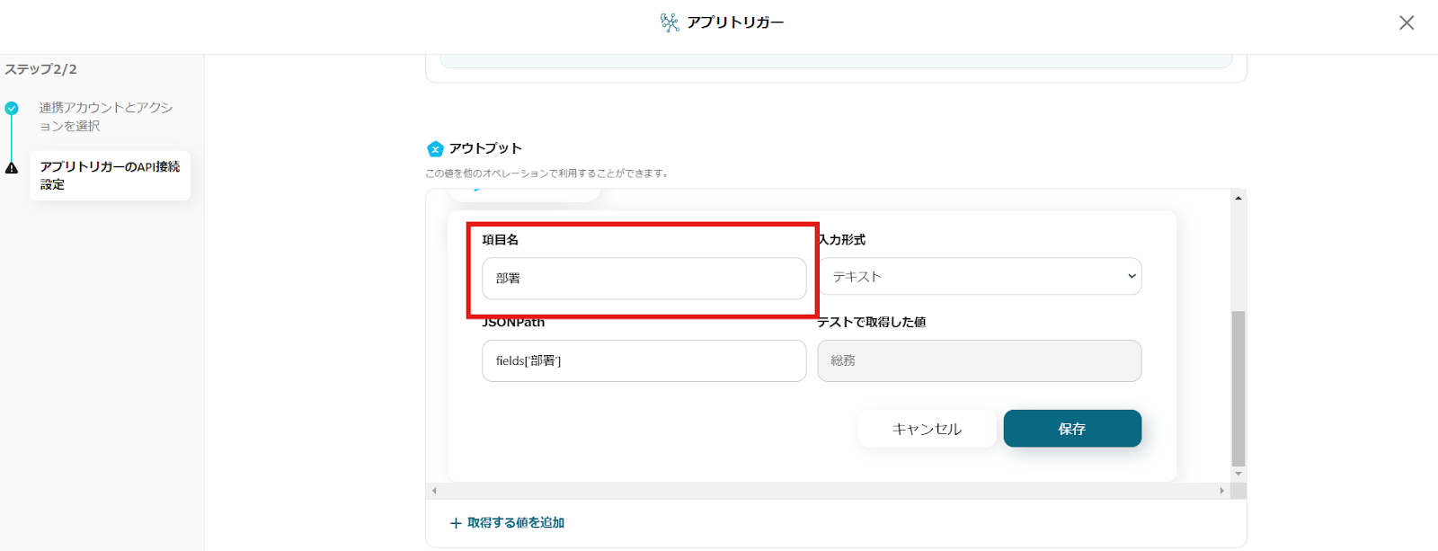 今回はテンプレートを活用しているため、あらかじめ取得済みの値が存在します。そのため、取得していない「部署」を選択してみましょう。
